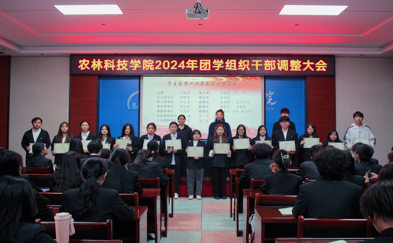 (投稿:卞家盈、向爱琼)为任命一批具备领导力、团队协作能力和创新思维的新一届学生干部,以形成结构合理、素质优秀的学生干部队伍,11月13日中午,农林科技学院在42D视频会议室成功举办了2024年团学组织干部调整大会。农林科技学院团总支书记胡玲、学工处干事董媛媛、新老团总支书记处成员、学生会主席团成员以及新老干部和各部门干事代表参会。