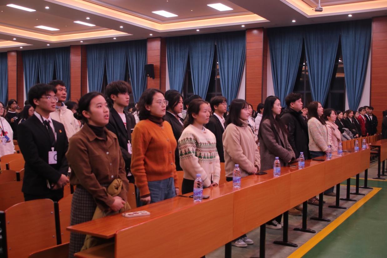 随后,激动人心的团旗、院旗交接仪式的开展,不仅象征了责任的传递,更代表着学院精神的延续与发扬。在全场师生的见证下,第十四届团总支与学生分会的代表郑重地将团旗和院旗交给了新一届的学生干部。新任团总支代表邓宏立与学生分会代表黄鲜分别发言。他们阐述了团总支与学生分会今后的工作方向,强调了两大组织作为学院先进组织的重要地位,以及如何更好地开展互帮互助的工作,共同为全院师生提供优质服务。