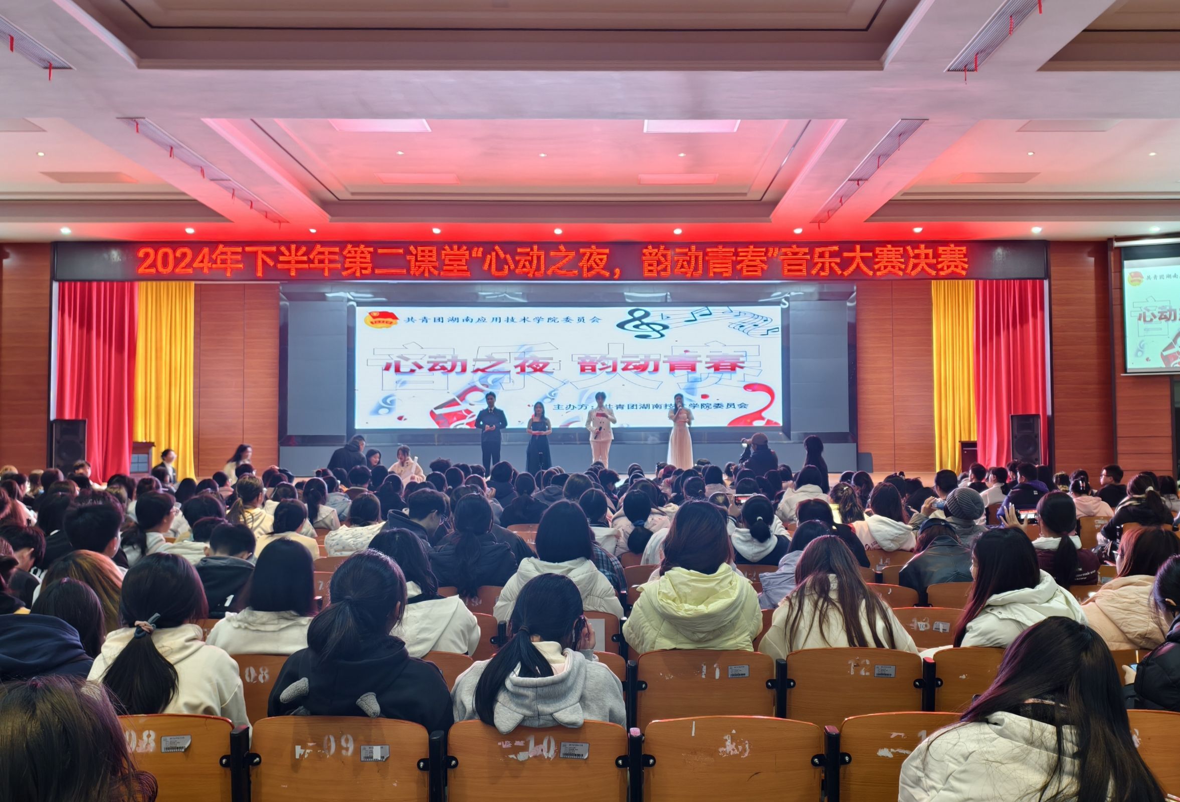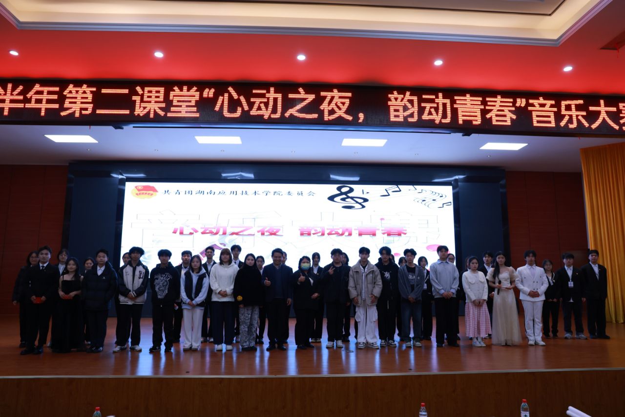 (投稿:张乐怡、邹志广)12月3日晚,伴随着阵阵掌声与欢呼声,由共青团湖南应用技术学院委员会举行的2024年下半年第二课堂“心动之夜,韵动青春”音乐大赛于西校区43D二楼会议厅圆满结束。团委书记陈磊、团委办公室主任陈安琪、团委指导老师袁苑、我校教师刘振亚出席并担任评委,另设30位学院代表作为大众评委现场评分,保证比赛的公平性。