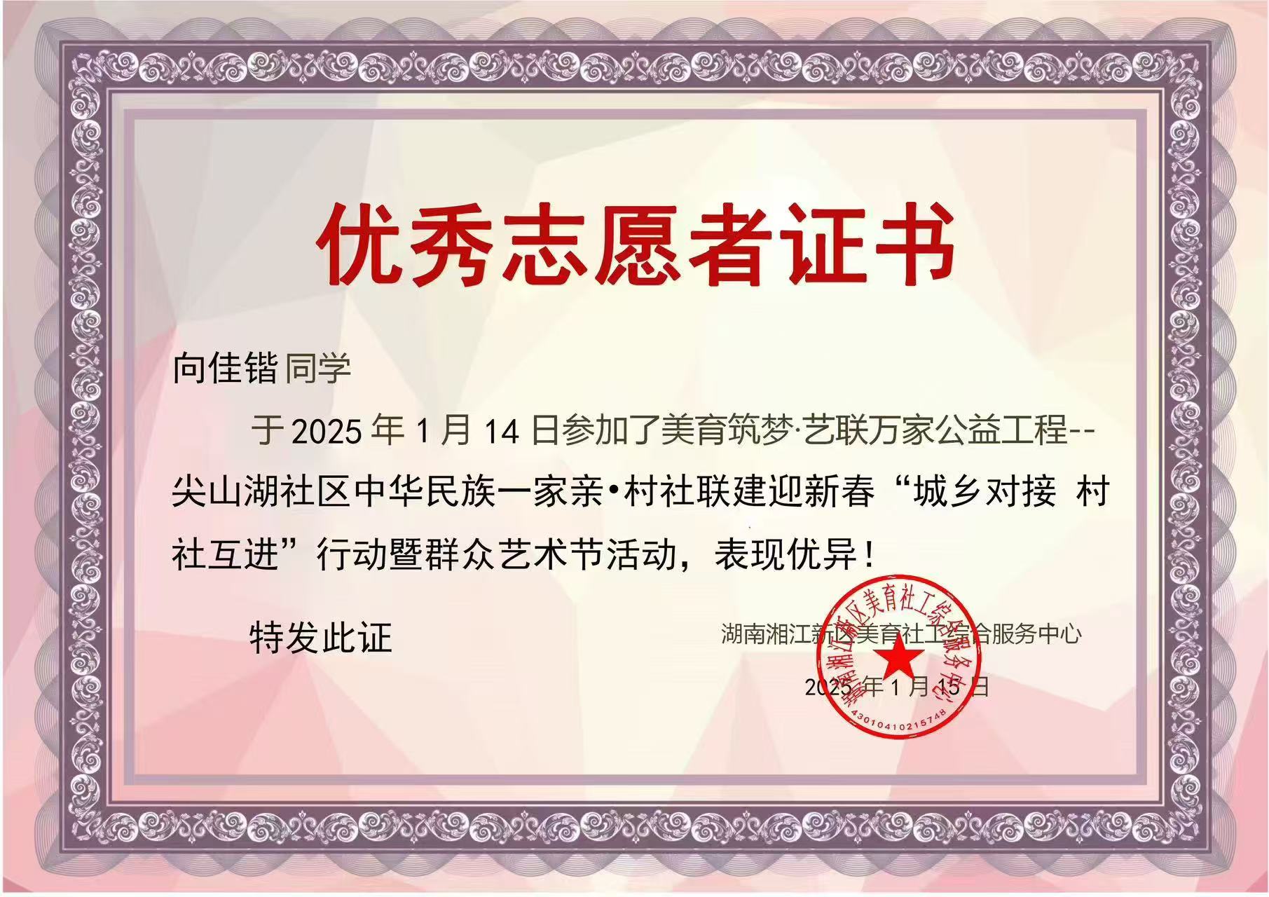 蛇年的脚步渐近,村社携手搭建起温暖桥梁,一同迎接新春的欢乐与希望。2025年1月14日,湖南省长沙市岳麓区尖山湖社区成功举办了以“城乡对接、村社互进”为主题的“中华民族一家亲·村社联建迎新春”群众艺术节活动。我校信息工程学院学子向佳锴积极投身其中,以全程的用心付出,荣获“优秀志愿者”荣誉称号。
