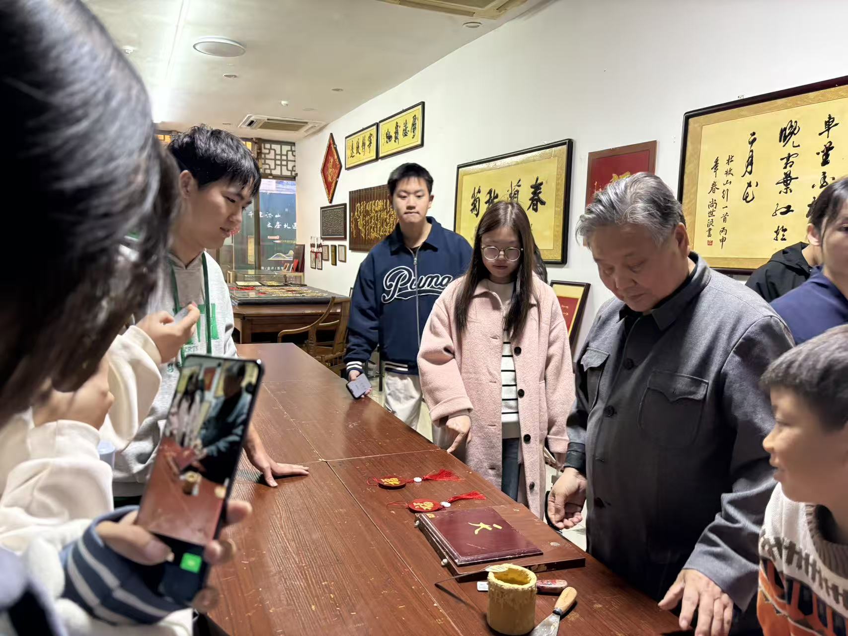 一个多小时的沉浸式参观中,场馆讲解员以生动的叙事串联起金石锤画、竹编、女书、泥书、皮影戏等非遗项目——师生们的指尖抚过金石锤画的凹凸肌理,目光追随着竹编的经纬纹路,耳畔回响起女书字符的千年故事,皮影戏幕布上的灵动画面更让传统文化“活”了起来······在非遗技艺的匠心与文脉中,师生们直观地触摸到中华优秀传统文化的独特魅力,更深刻体会到这些瑰宝是各民族共同创造、代代相传的精神财富,是中华民族共同体的文化根基。