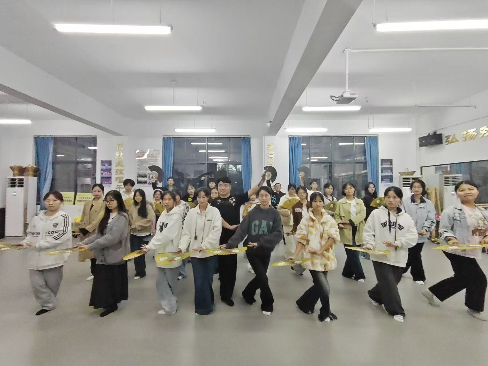 课程特邀专业戏曲教师宋晓峰担任主讲,聚焦国家级非物质文化遗产“常德花鼓戏”,吸引了来自各个学院的三十余名同学参与。宋老师讲解了中国戏曲的发展脉络与艺术特色,重点介绍了常德花鼓戏的唱腔、表演风格及代表剧目,并现场示范了折扇、手绢等道具的基本运用技巧。同学们踊跃上台尝试,亲手体验戏曲动作,现场气氛热烈。来自信息工程学院的同学表示:“亲手舞动扇子和手绢,才真正体会到这门艺术的精妙。”
