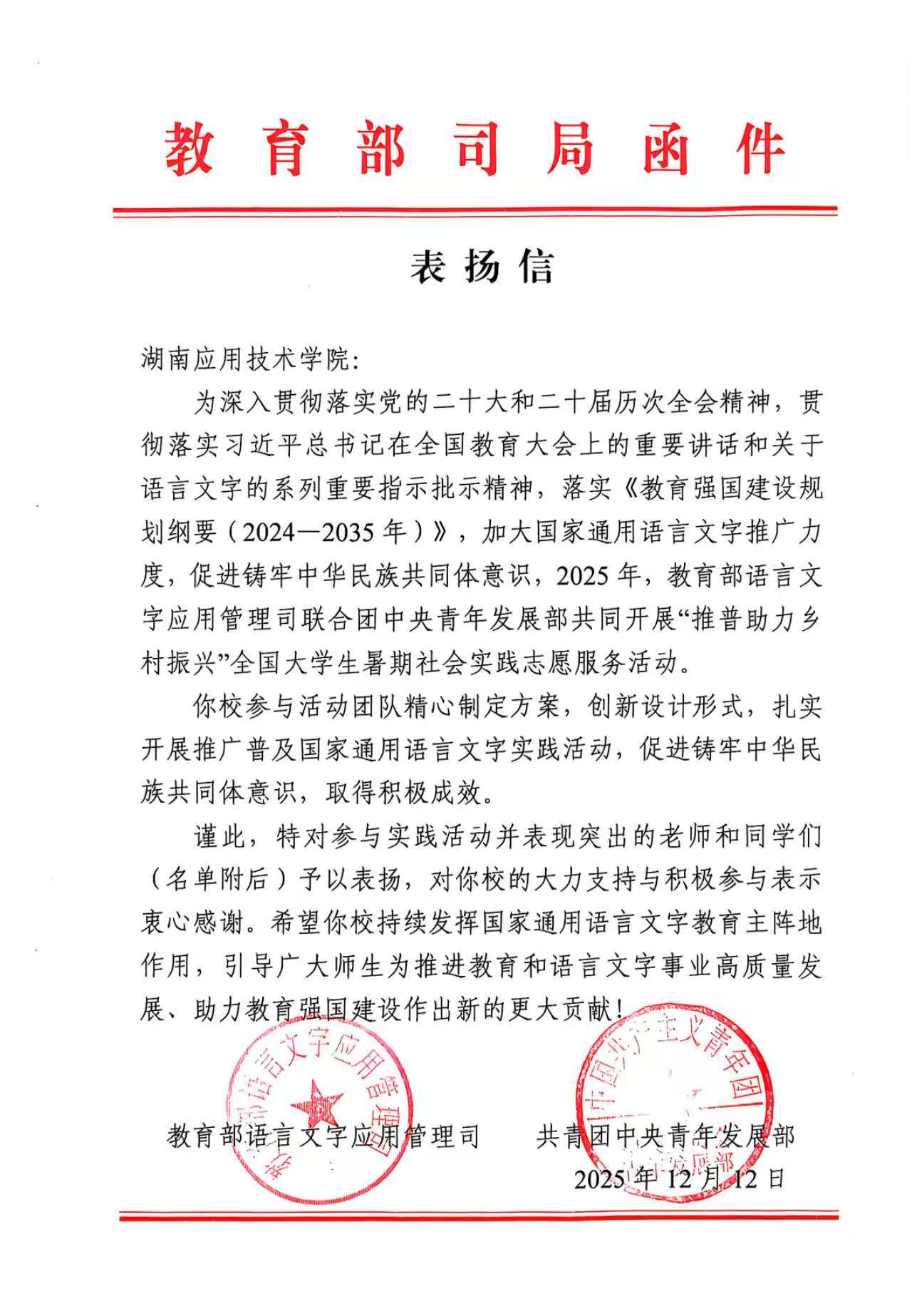经济管理学院“推普助力乡村振兴”团队获教育部、共青团中央表扬