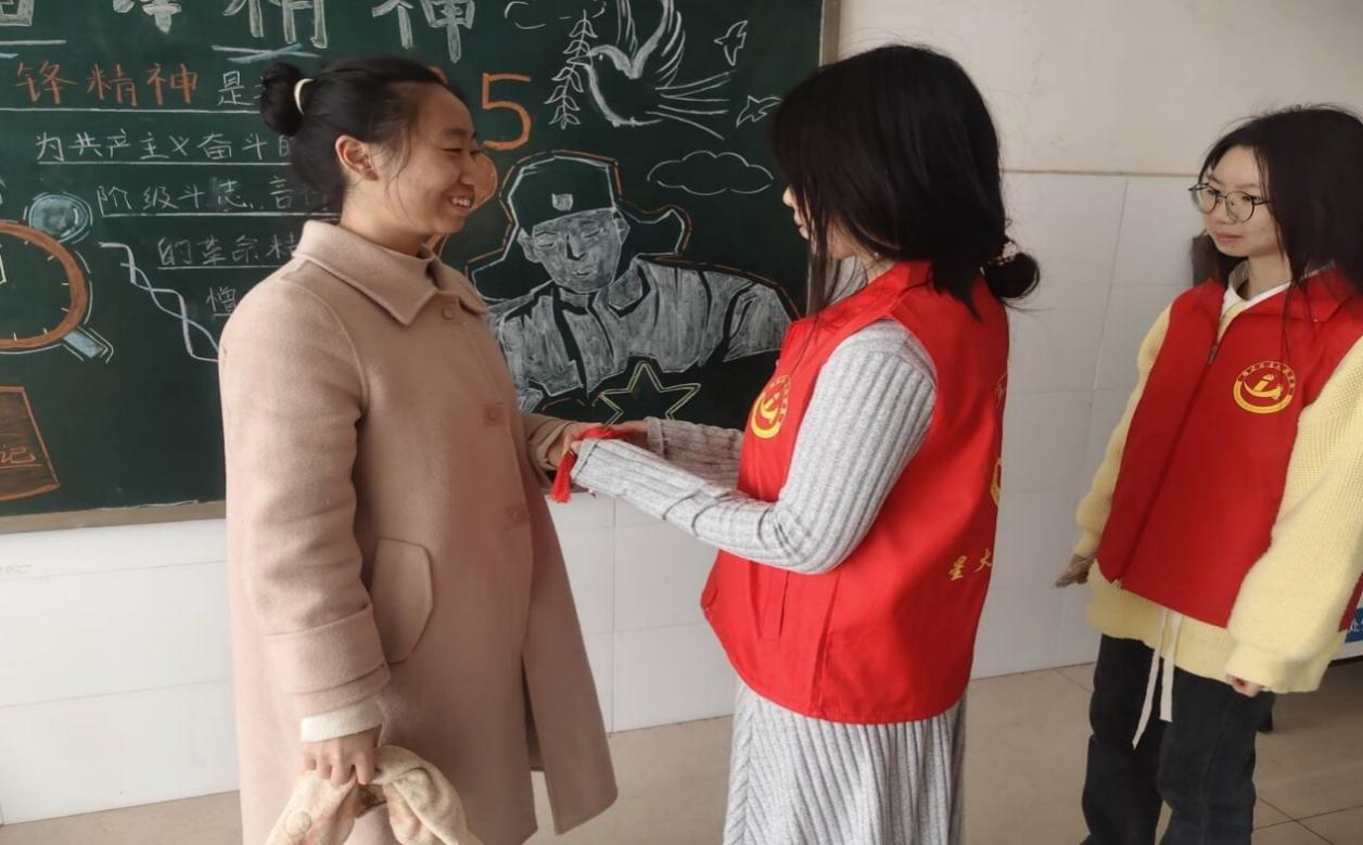 香囊制作完成后,学院青年志愿者化身学雷锋志愿先锋队,带着满载心意的香囊开启校园暖心派送行动。他们走进宿舍楼栋,向坚守岗位、守护学子起居的宿管阿姨送上香囊,致谢日复一日的辛勤值守;走访学生寝室为同窗送去惊喜,传递暖心关怀;途中还为默默美化校园的环卫工人、过往师生送上香囊,致敬平凡岗位上的坚守付出,让志愿暖流流淌在校园每个角落。