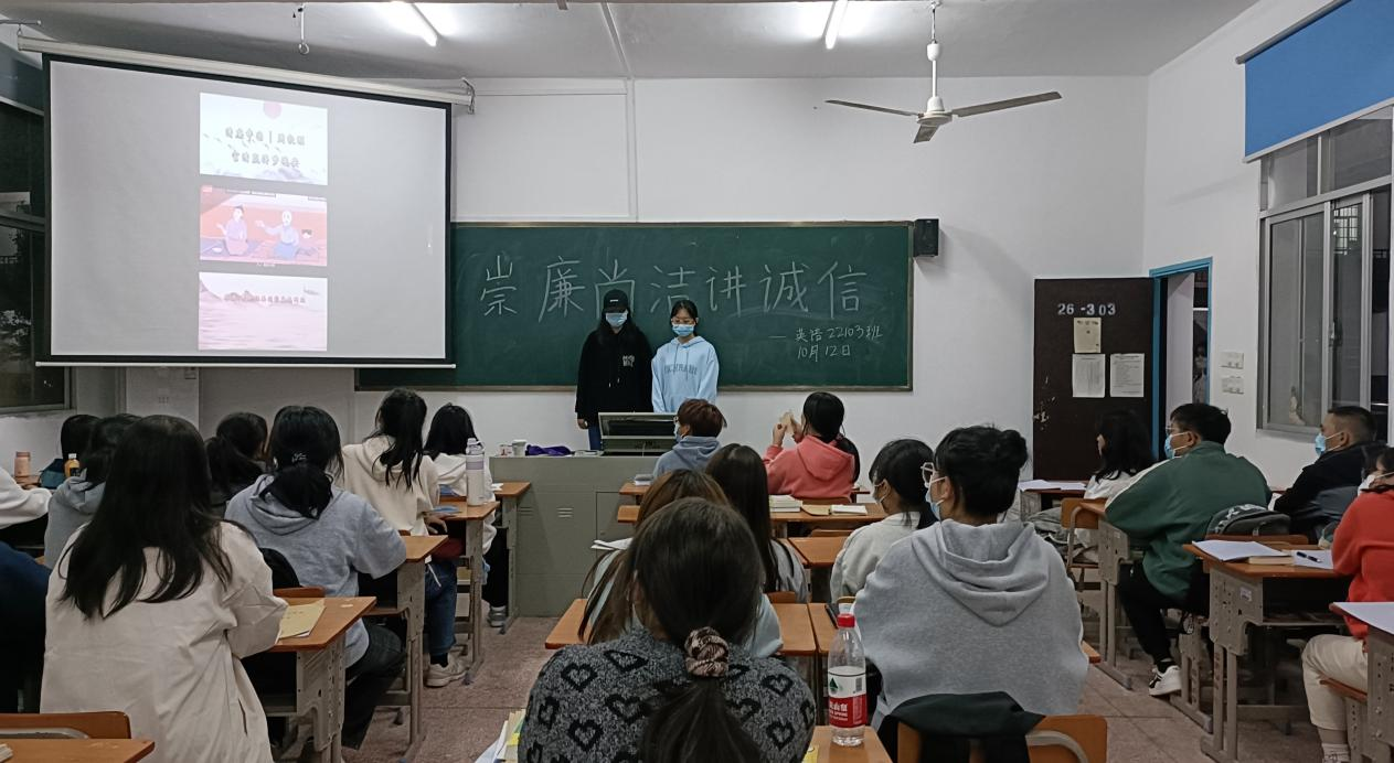10月12日至14日,为培养外国语学院学生的思想品德建设,提高同学们的整体素质,加强诚信教育,外国语学院团总支组织大一、大二、大三年级召开“崇廉尚洁讲诚信”的主题班会。