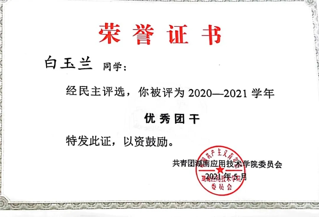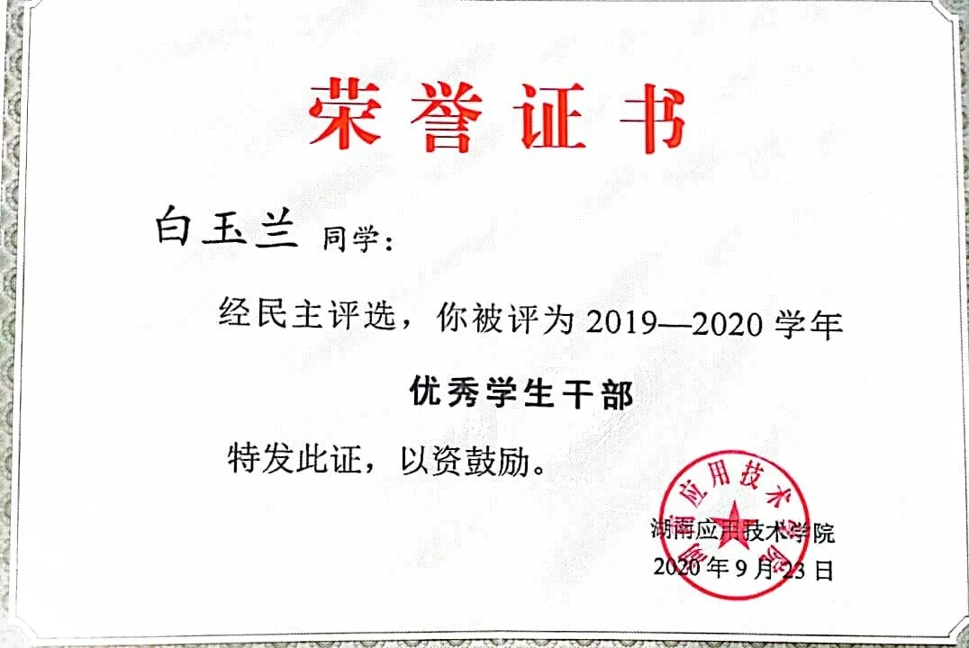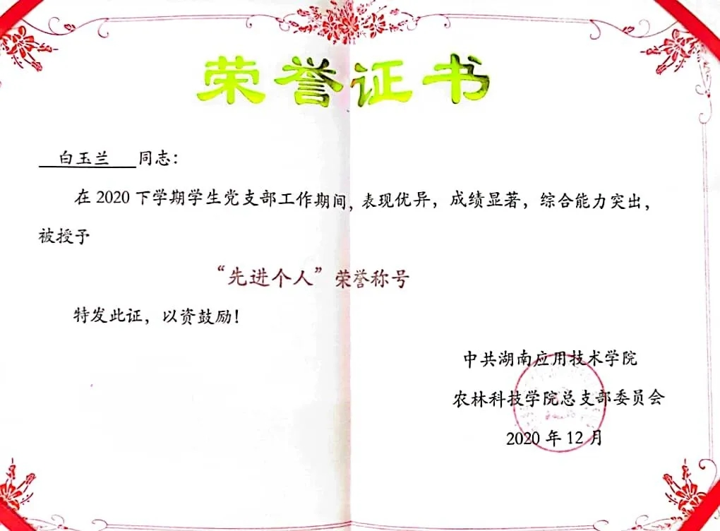 白玉兰同学在校期间严格遵守学校规章制度,以严格的标准要求自己,努力做到全面发展。无论在学习上还是在工作上都刻苦努力且认真负责,成绩上名列前茅,思想上积极上进。